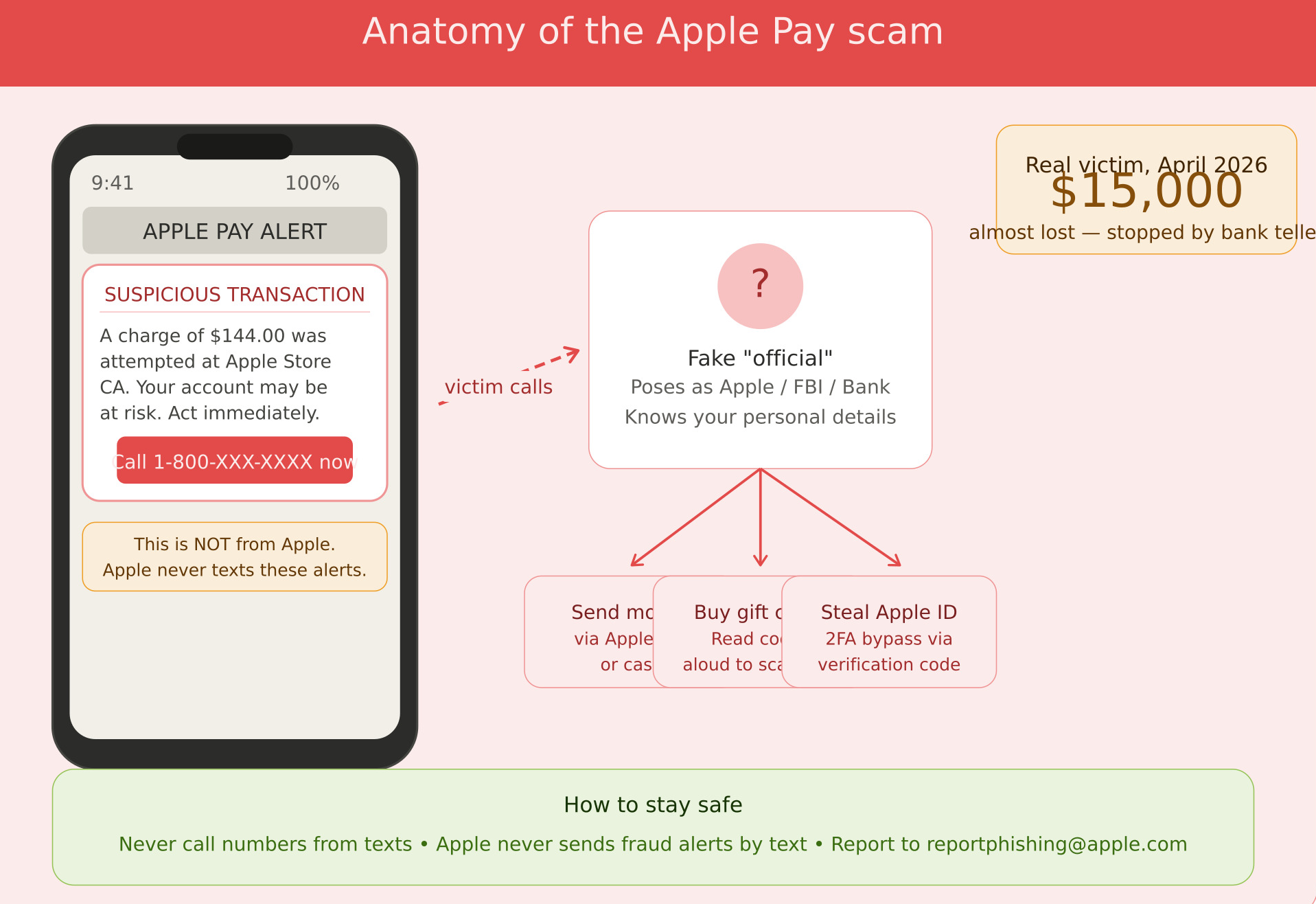 The red flags are consistent across every version of this scam: an unexpected message about Apple Pay activity, a phone number in that message, pressure to act right now, someone asking for codes or passwords, instructions to move money or lie to your bank.
