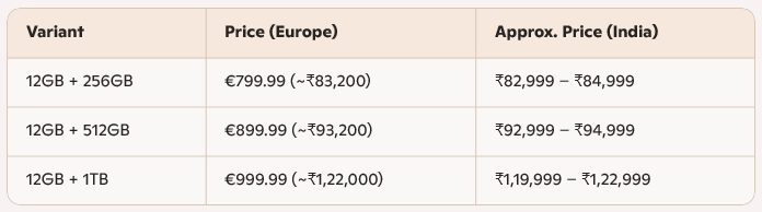 • 12GB LPDDR5X RAM with storage options: 256GB, 512GB, and 1TB (UFS 4.1)